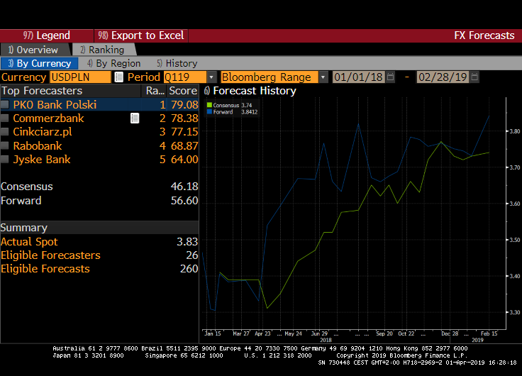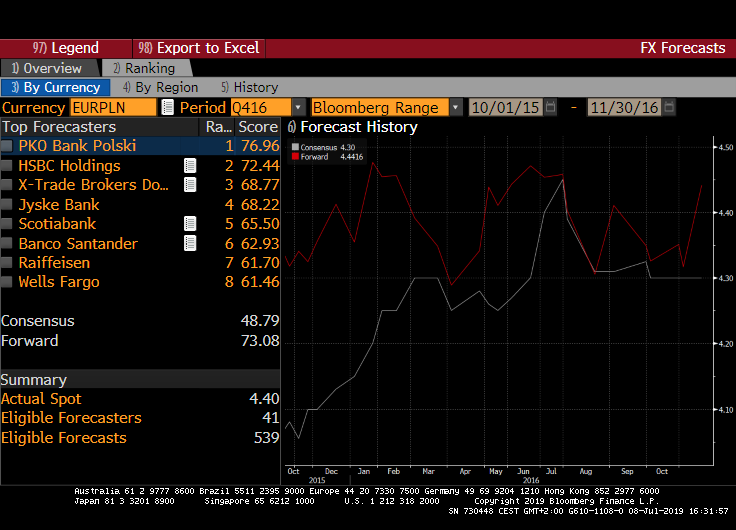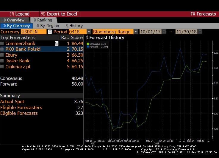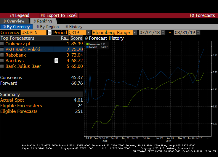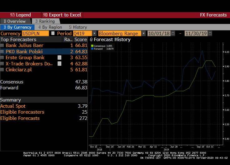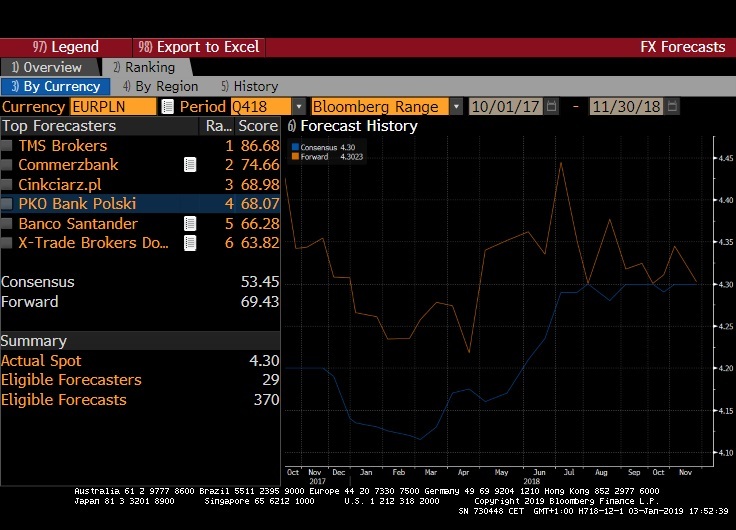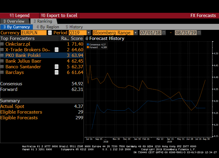 Bloomberg ranking prognoz kursu EUR/PLN: