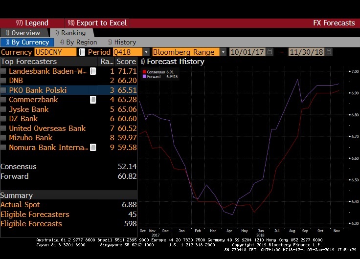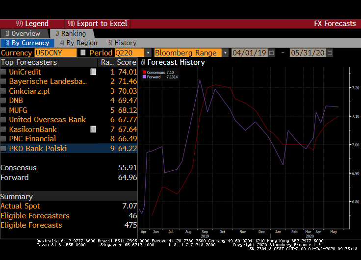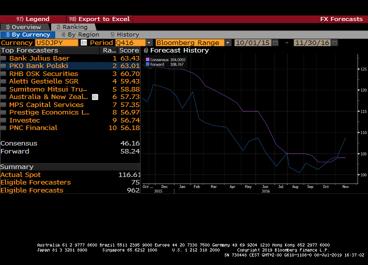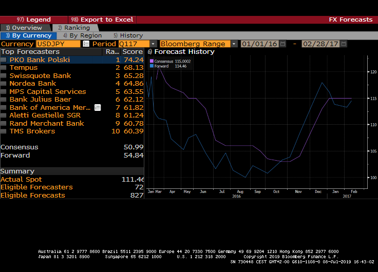 W latach 2016-2020 Jarosław Kosaty, działając jako Strateg Walutowy dla PKO Banku Polskiego, brał udział w rankingu walutowym Bloomberga. Poniżej prezentujemy jego wyniki prognostyczne dla różnych koszyków walut oraz poszczególnych par walutowych. W rankingu występuje jako PKO Bank Polski, a agencja Bloomberg wielokrotnie komentowała jego trafne prognozy (linki do artykułów Bloomberga znajdują się pomiędzy wynikami prognostycznymi).