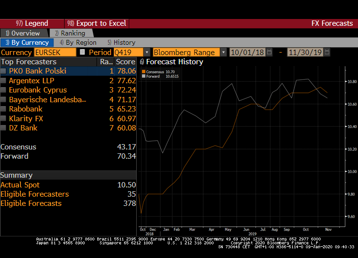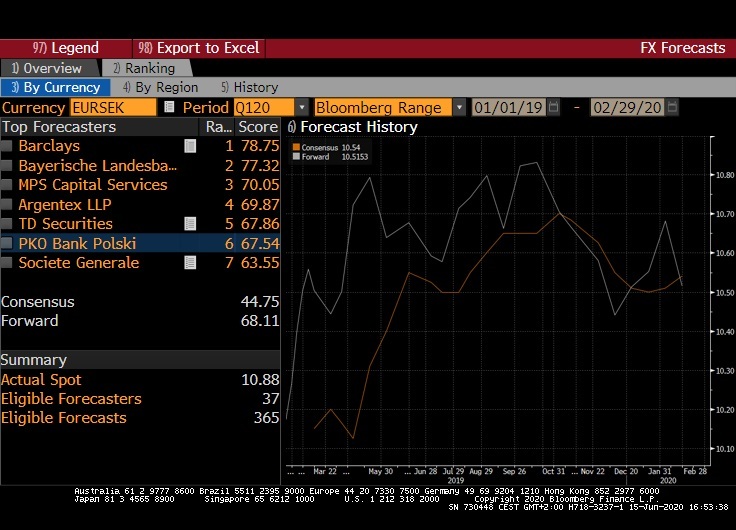 Bloomberg ranking prognoz kursu EUR/SEK: